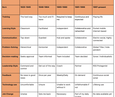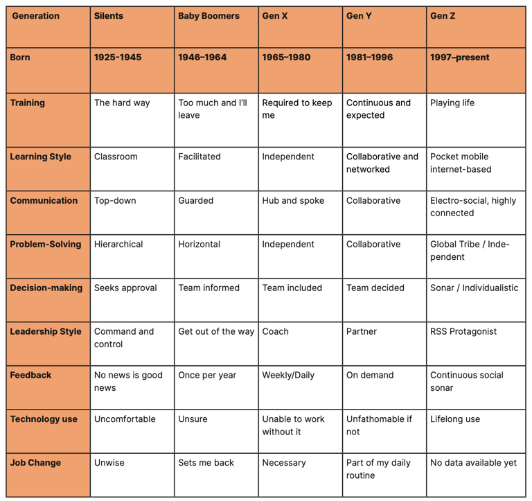 I have had quite a few coaching sessions 🕡 with leaders and one topic keeps coming across. How do I work with Generation Z 🧬 (1997-present) employees? I believe part of the issue is not so much about Gen Z as a separate group, but more so that leaders need to lead all types of generations. These generations range from Baby boomers (1946– 1964) who are soon retiring, Generation X (1965– 1980) and Gen Y/Millennials (1981–1996) who are currently in or are taking on leadership roles, and Gen Z (1997–present) who are entering the workforce. Leaders are facing the challenge 😰 on how to take into account the different values, communication, feedback, training and development styles into account of such a wide scale.